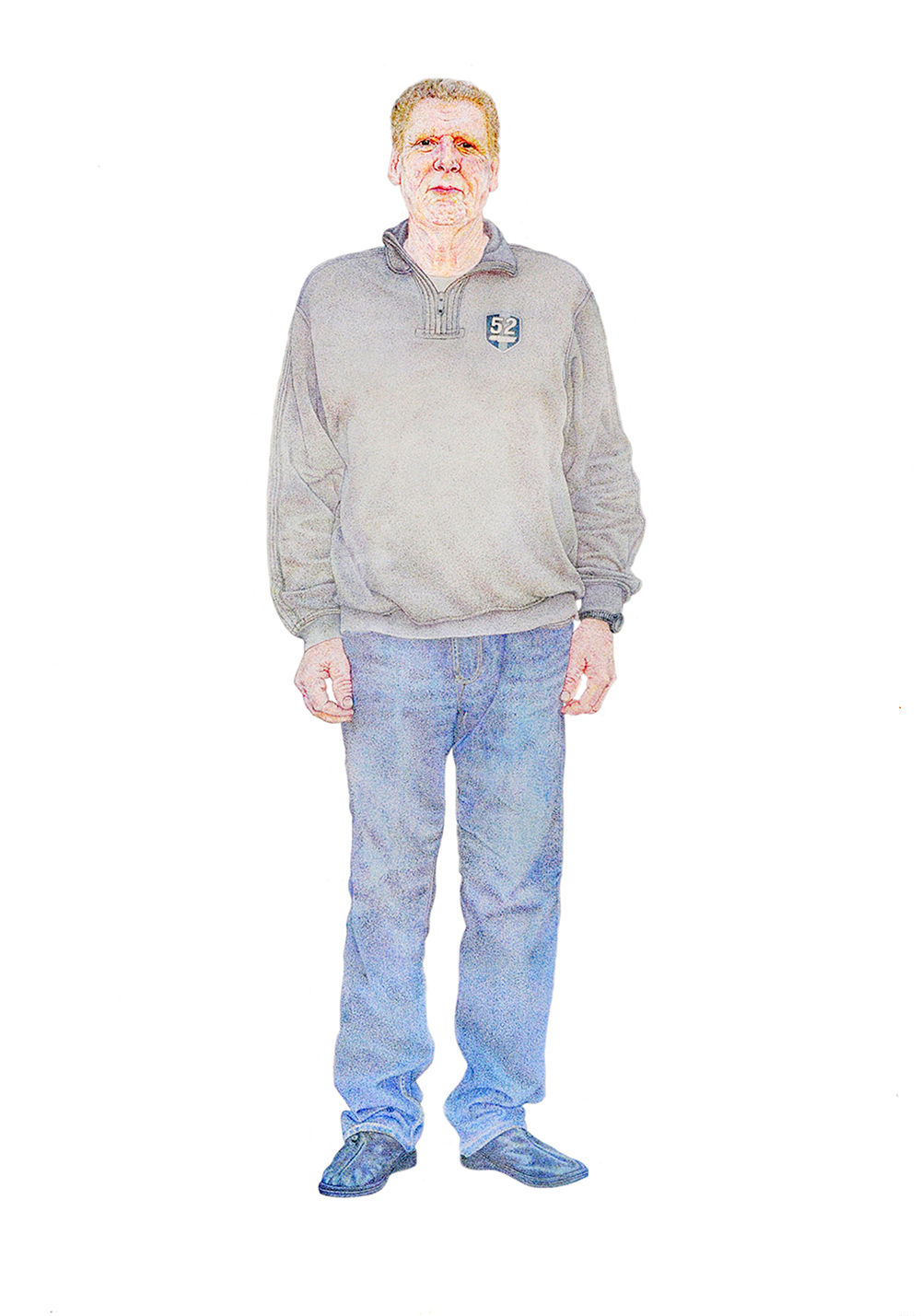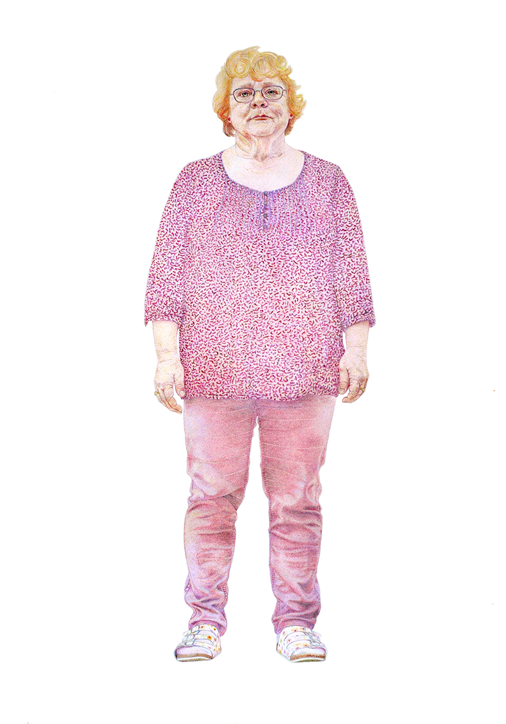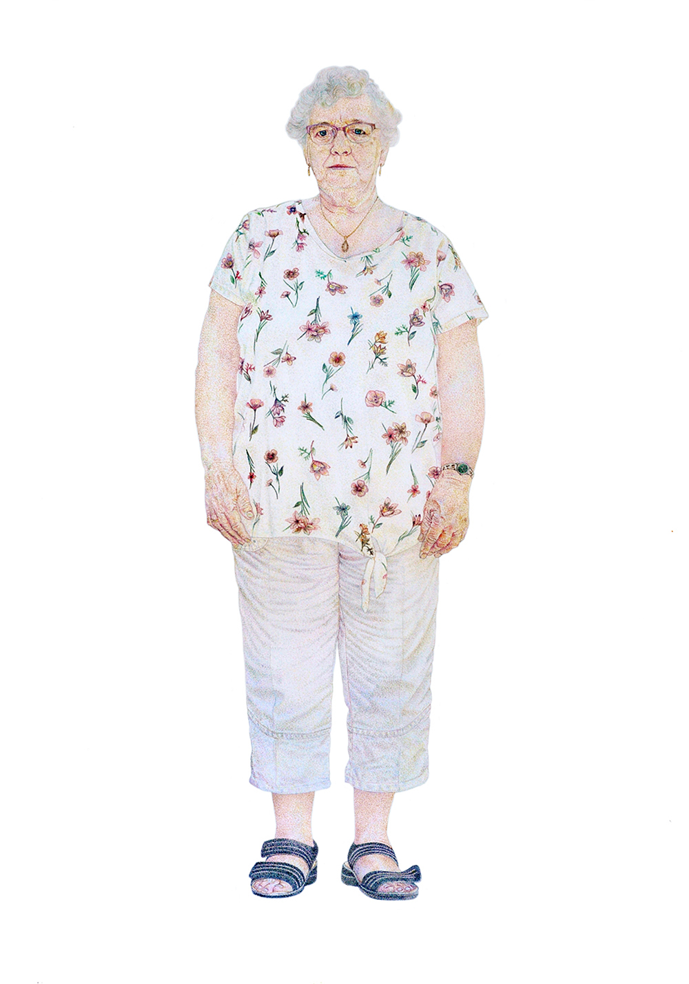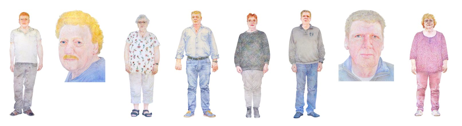 Oom Piet#1+#2 (gemaakt in 2024), Tante Bep, Oom Wim, Tante Janny, Oom Frits#1+#2 (gemaakt in 2023), Tante Ria, allen 100 x 70 cm, kleurpotlood op papier.