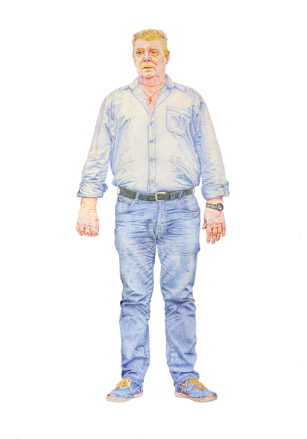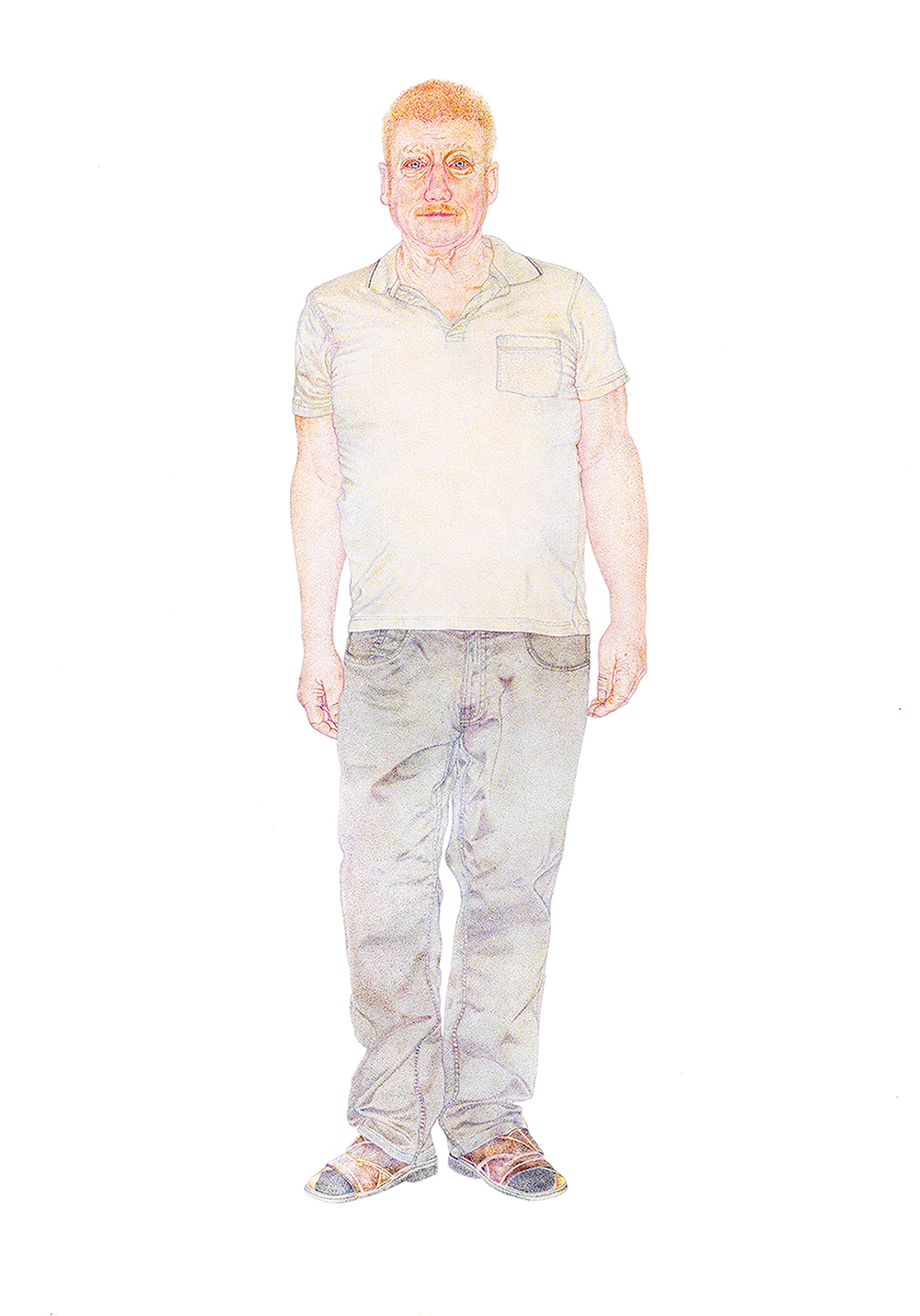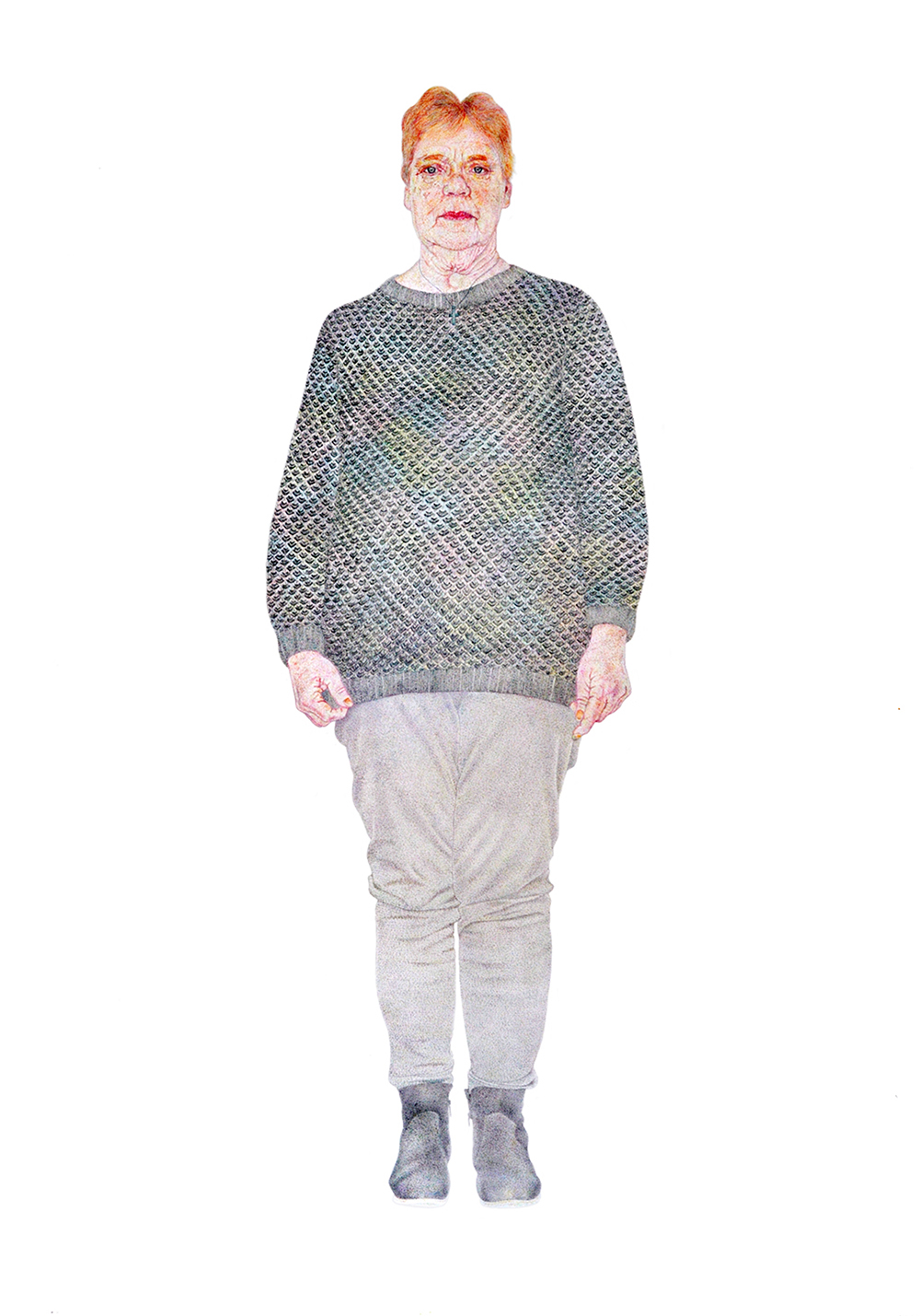 Oom Piet#1+#2 (gemaakt in 2024), Tante Bep, Oom Wim, Tante Janny, Oom Frits#1+#2 (gemaakt in 2023), Tante Ria, allen 100 x 70 cm, kleurpotlood op papier.