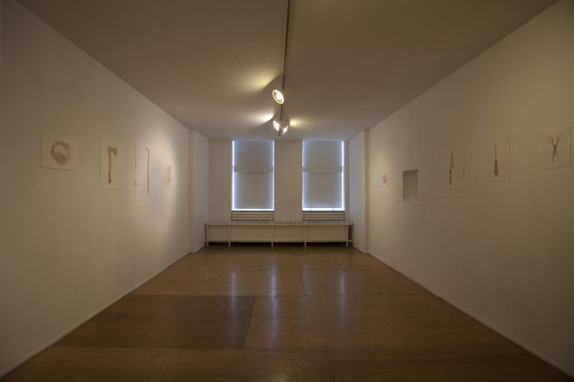 Koevoet (100 x 70 cm), Broodmes (59 x 42 cm), Bijl (59 x 42 cm), Hakmes (59 x 42 cm), Hamer (42 x 29.5 cm), Schroevendraaier (42 x 29.5 cm), Stanleymes (29.5 x 29.5 cm), Vork (29.5 x 21 cm), Schaar (29.5 x 21 cm), Baksteen (42 x 29.5 cm), Veter (21 x 21 cm), Theedoek (29.5 x 29.5 cm), Stropdas (29.5 x 29.5 cm), Broekriem (#2) (29.5 x 29.5 cm), Broekriem (#1) (42 x 42 cm), Touw (68.5 x 68.5 cm), kleurpotlood op papier.