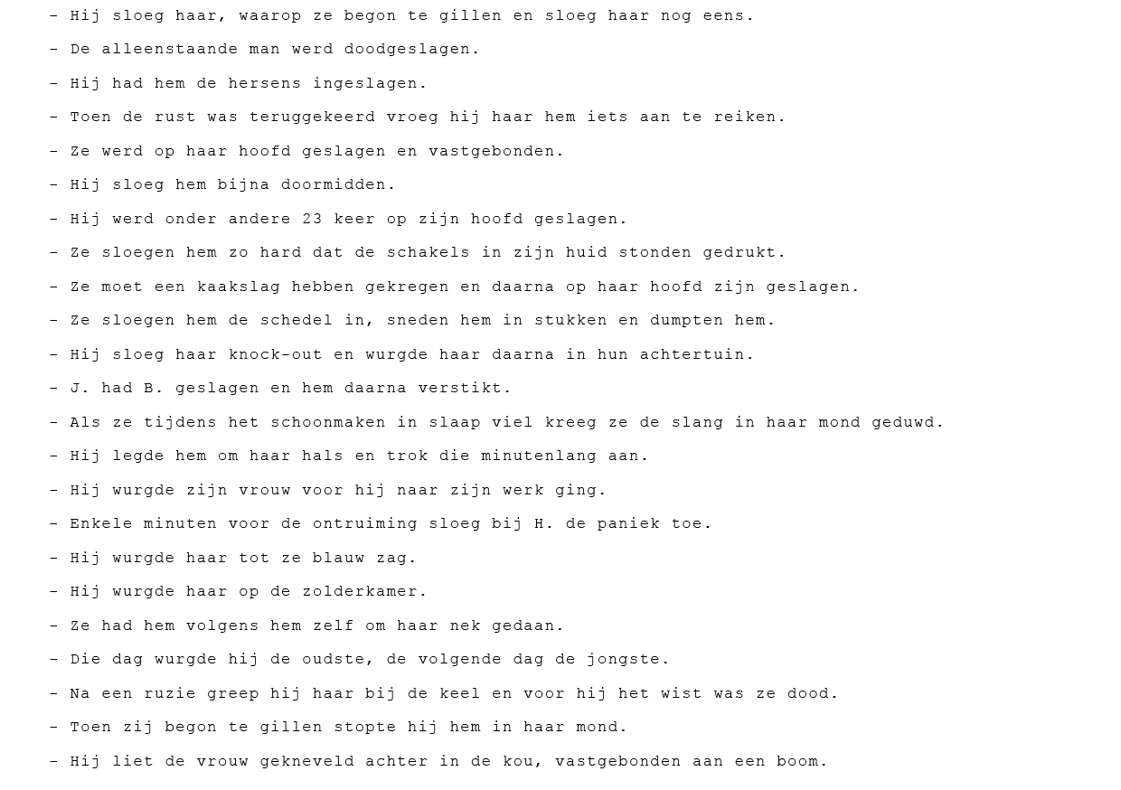 Ik vond een boek: ‘Moordenaars en hun motieven’ van Jef Vermassen. Vooral het hoofdstuk over moord en doodslag in de relationele sfeer greep me aan. Ik las meer boeken en legde een verzameling van zinnen uit kranten en tijdschriften aan waarin een huis-, tuin-, of keukenvoorwerp als moordwapen werd gebruikt. De zinnen zijn feitelijk opgeschreven. Het geweld dat erin voorkomt is hard en meedogenloos. Het boezemde me angst in. Om er grip op te krijgen maar ook om erachter te komen hoe de verhoudingen liggen tussen een dader en een slachtoffer, tekende ik de voorwerpen (niet de echte maar die ik gewoon thuis heb liggen) stip voor stip na alsof het een rituele handeling betrof. Ook nodigde ik dichter Guus Muller uit te reageren op het project. Dat resulteerde in een tekst over mijn werkwijze in relatie tot het onderwerp met als titel: ‘Monica tekent‘.